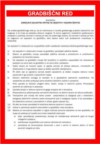 Gradbiščni red mora biti izobešen na vidnih mestih na vseh vhodih na gradbišče, v jedilnici in v vseh garderobah.
